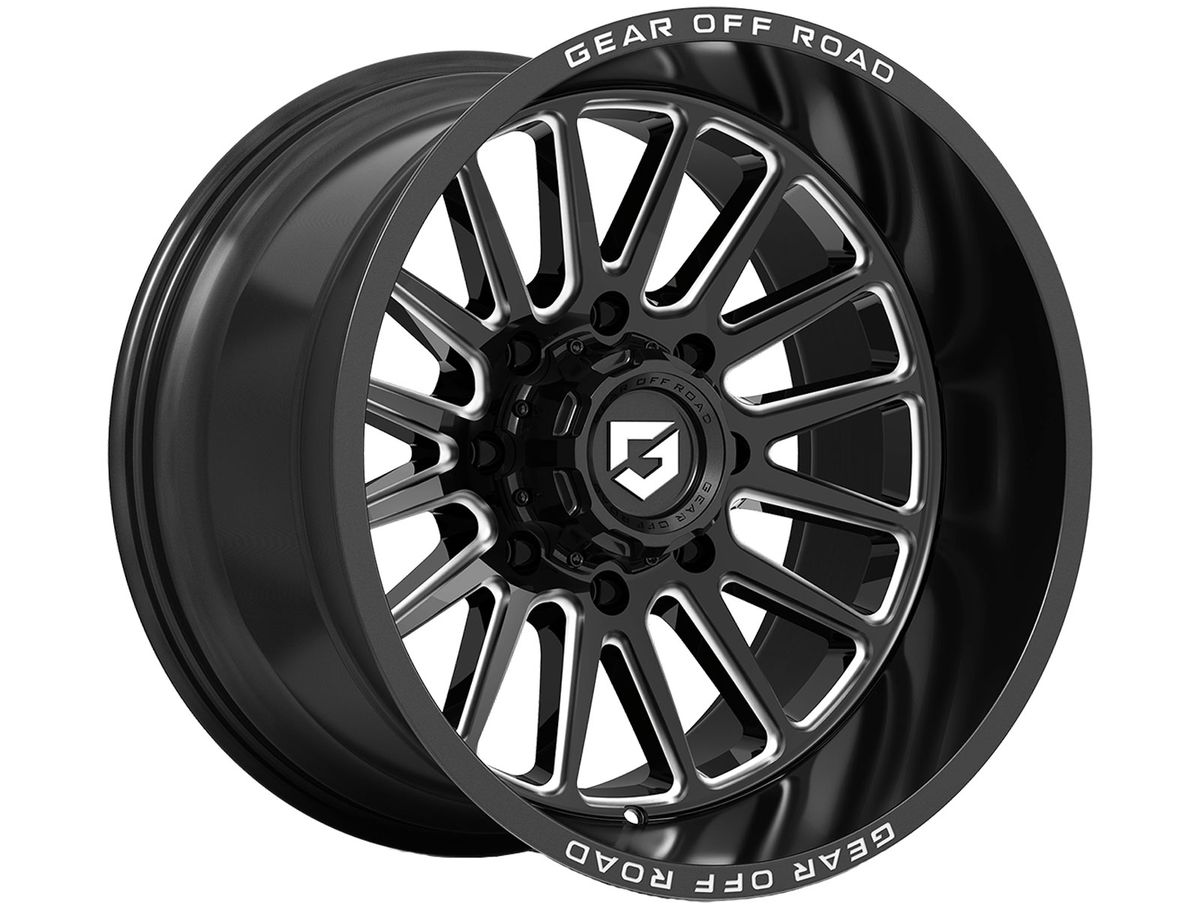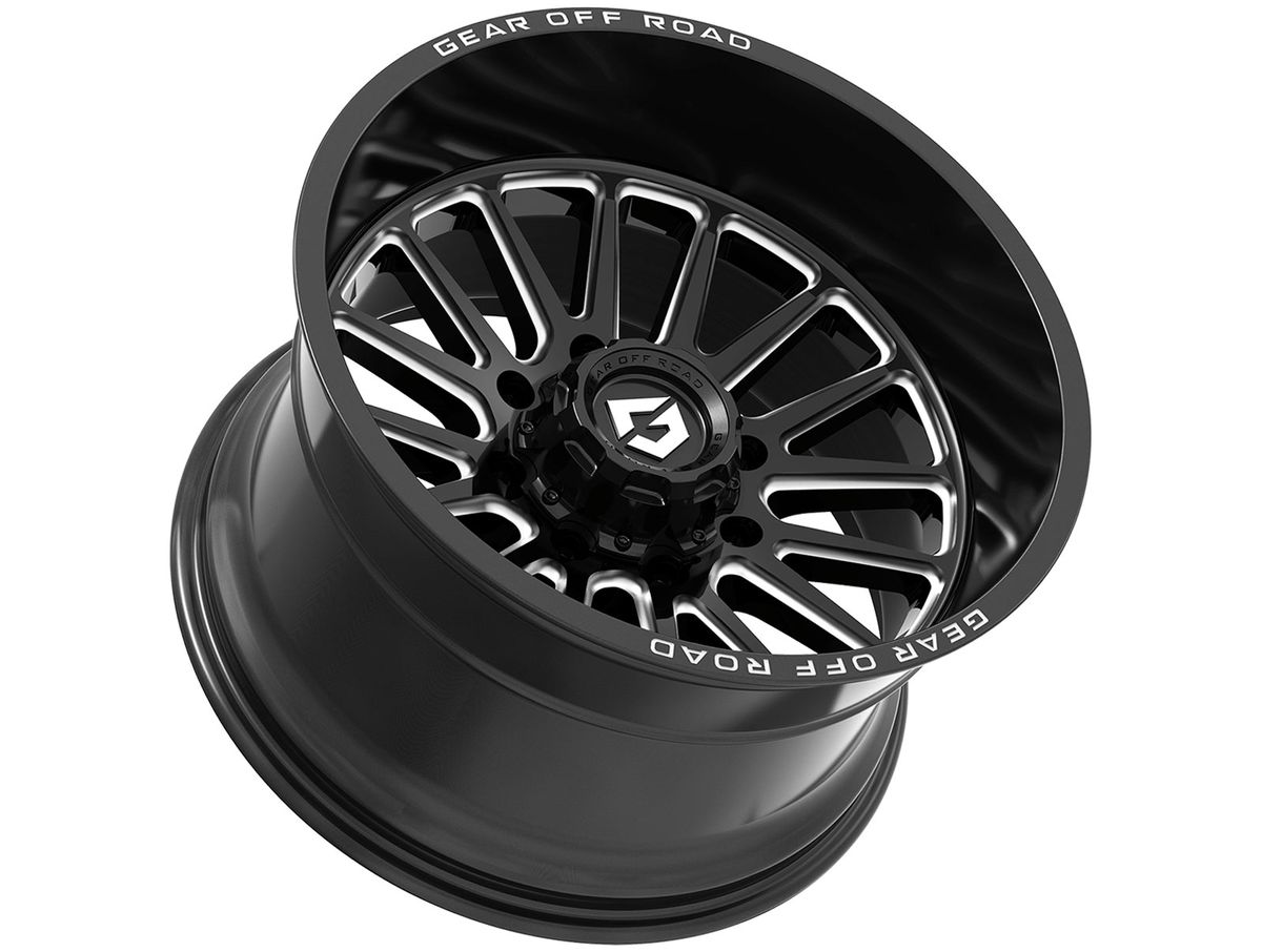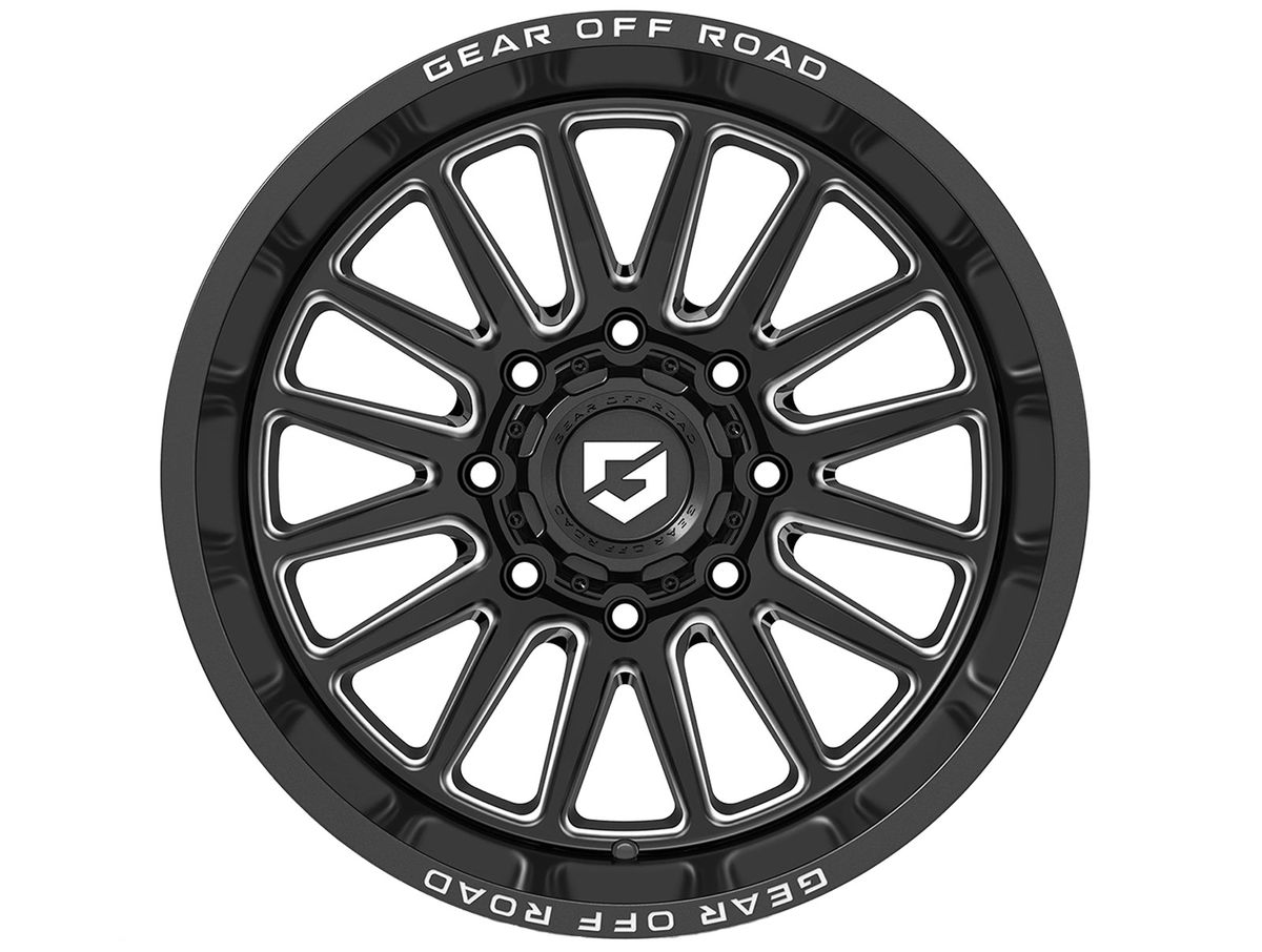 Each spoke features milled accents and windows with razor sharp angles. The wheel is covered in a gloss black finish that is offset with the brand name Gear Off-Road engraved around the outer edge. The center cap is adorned with the Gear Off-Road logo to complete the look.