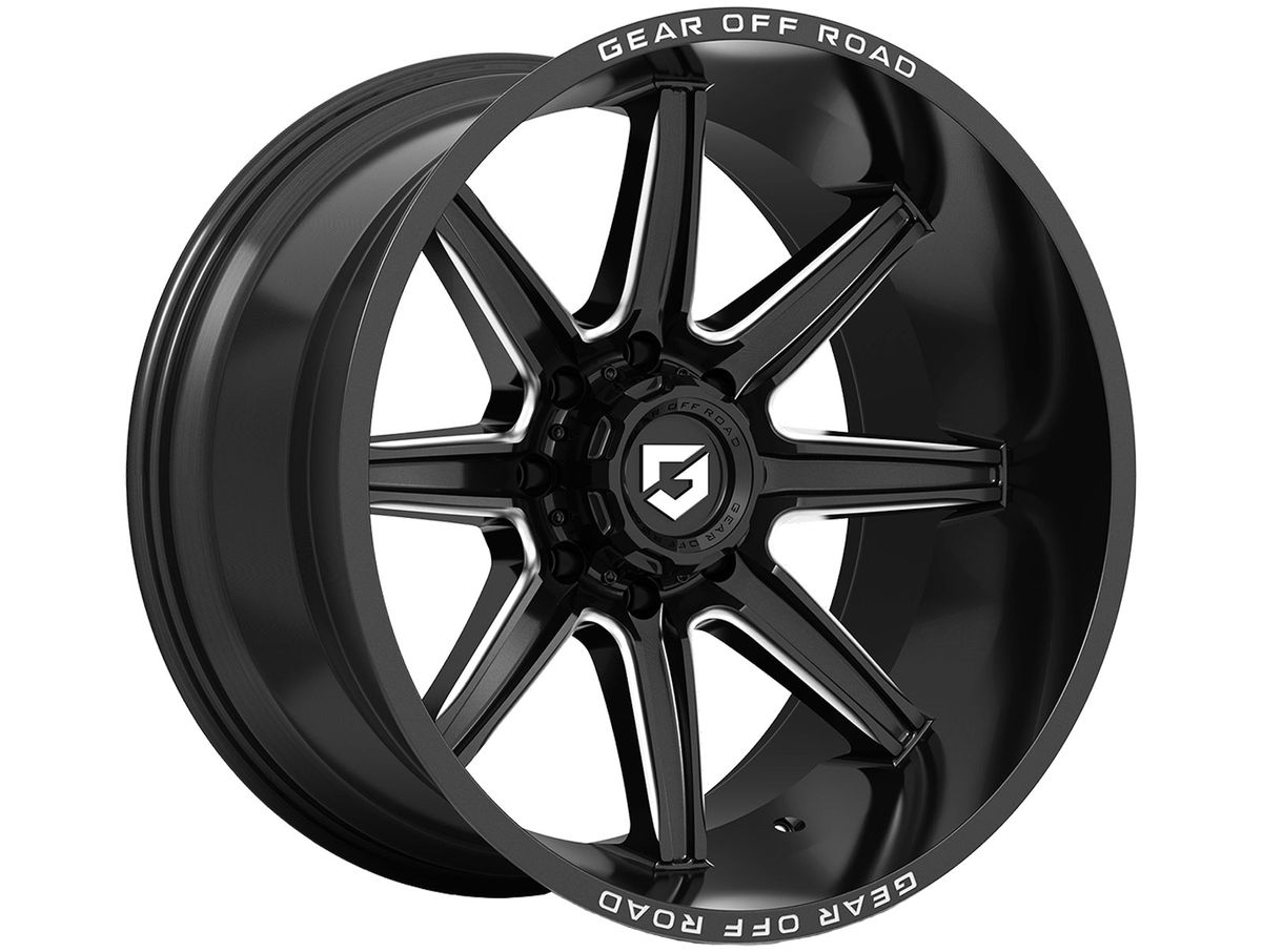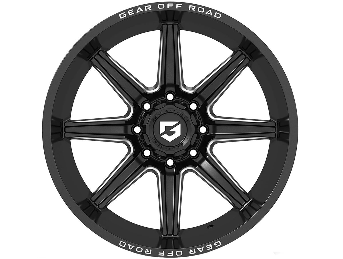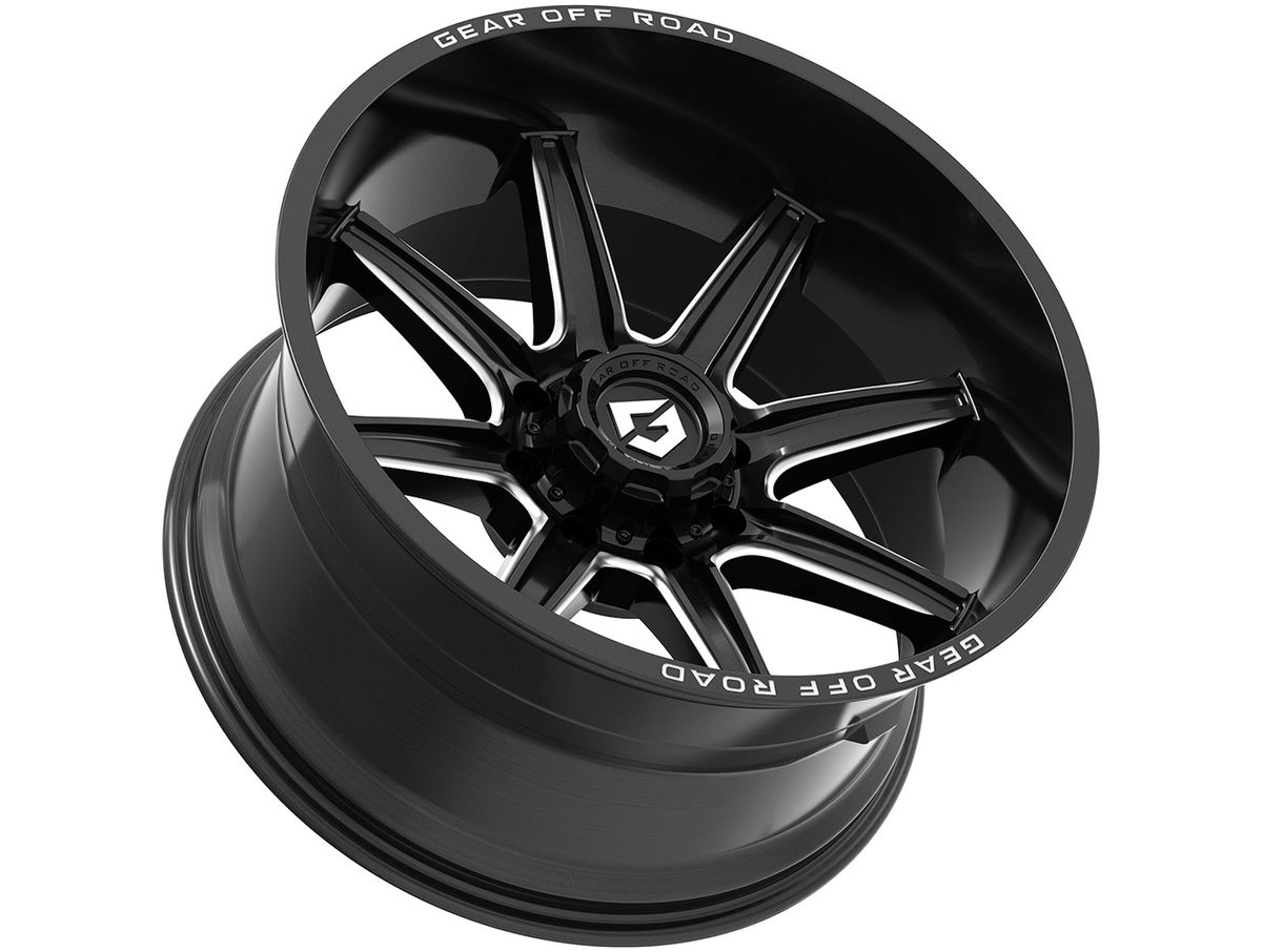 The wheel is covered in a gloss black finish that is offset by the milled spokes and Gear Off-Road engraved around the outer edge. The center cap is adorned with the Gear Off-Road logo to complete the look.