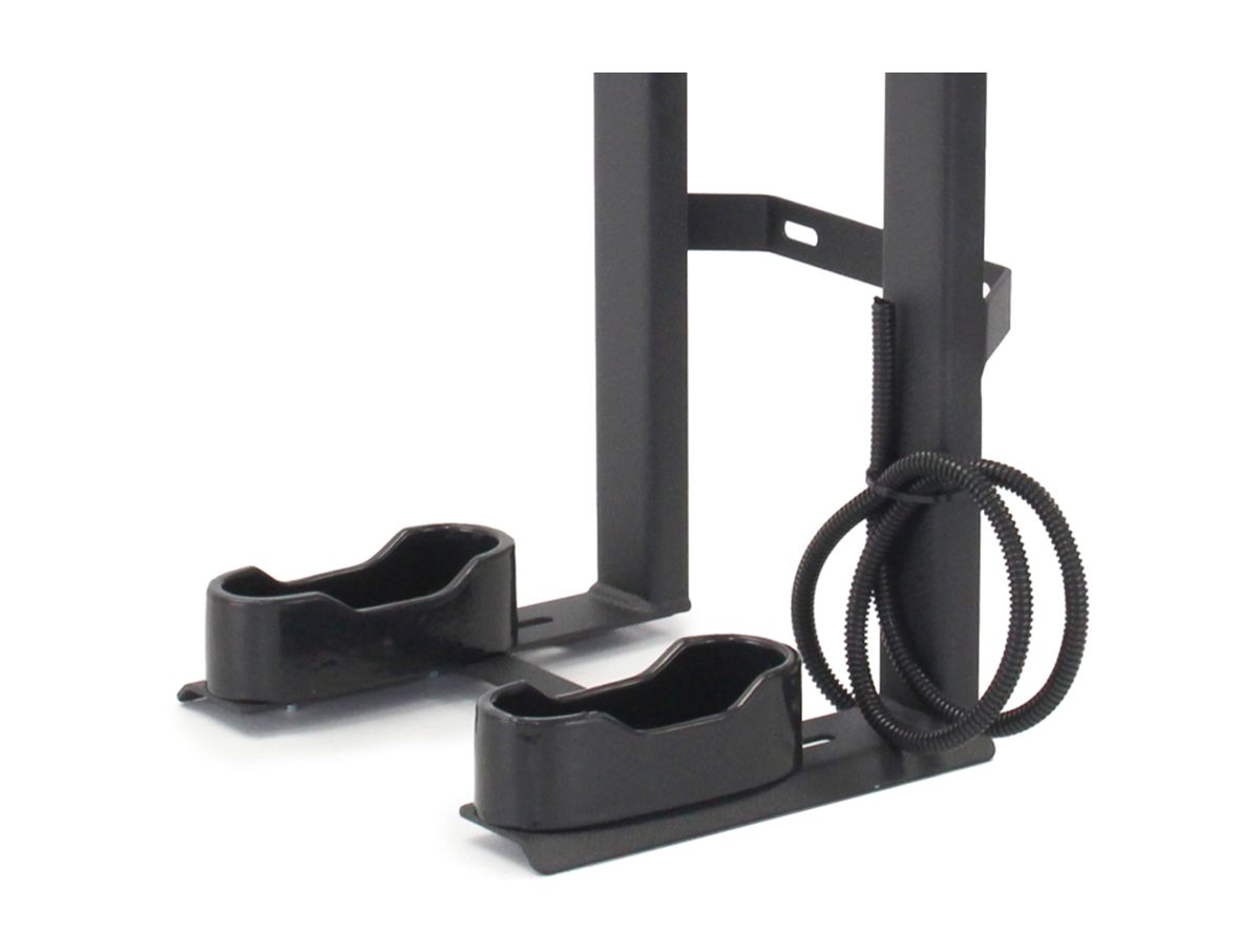 Go Rhino Dual Gun Rack allow law enforcement to safely mount their firearms. They work with any Go Rhino Public Safety partition with a recessed center panel. Gun locks, tactical flashlights, and flashlight holders are not included. The gun racks are constructed out of a mild steel in a textured black finish.