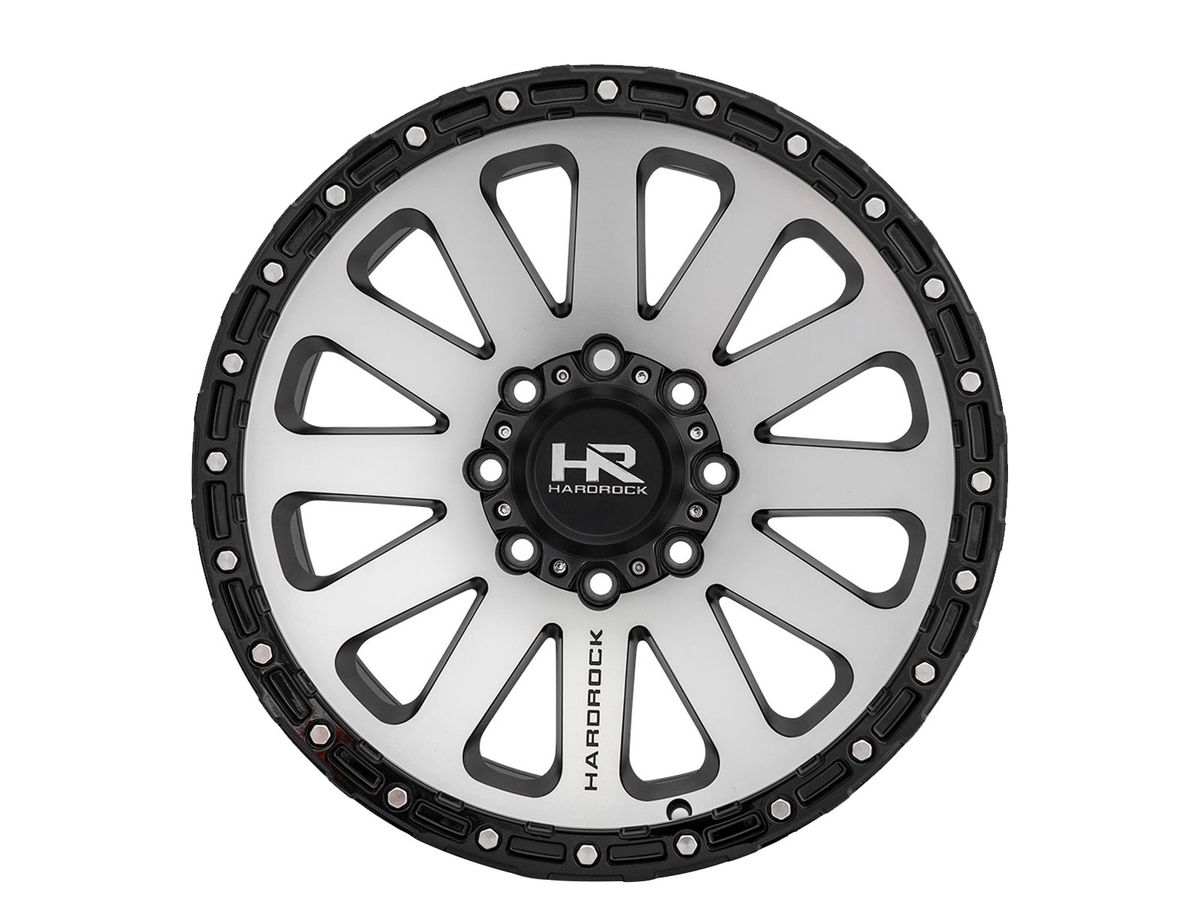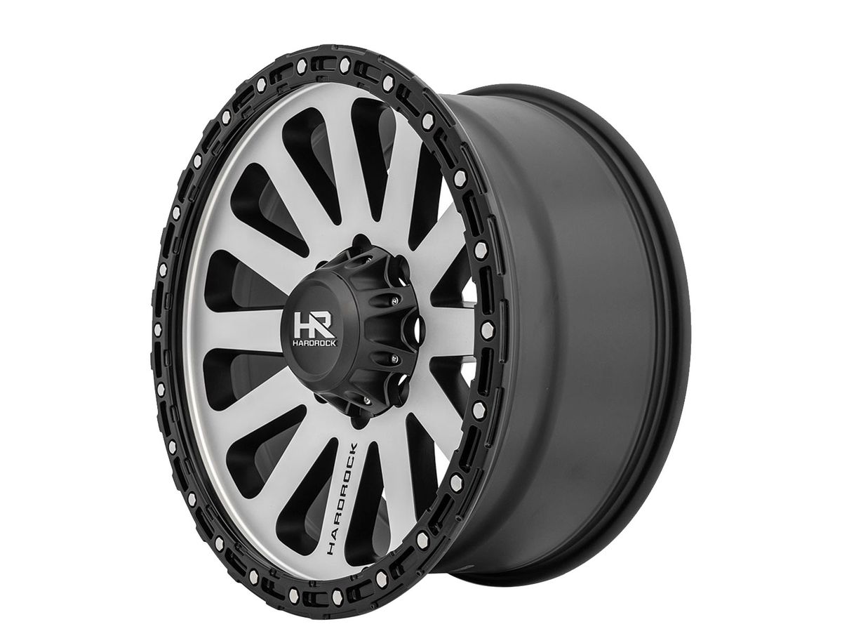 The spokes are split with a triangular shaped window creating depth and contour. The wheel is covered in a matte black finish that is offset by the simulated beadlock design around the outer edge. And to complete the look, the center cap is adorned with the Hardrock logo.