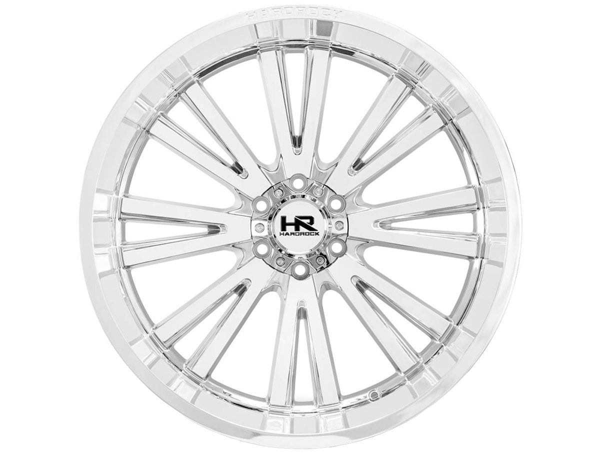 Each spoke features contoured accents that cover the center of the spokes as they meet at the center cap. The wheel is covered in a chrome finish that is offset by the brand name engraved around the outer edge. The center cap is adorned with the Hardrock logo to complete the look.