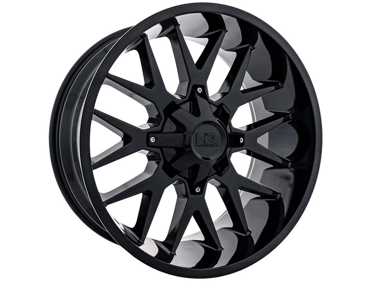 The spokes are split with a narrow window creating depth and contour. The wheel is covered in a gloss black finish. And to complete the look, the center cap is adorned with the Hardrock logo.