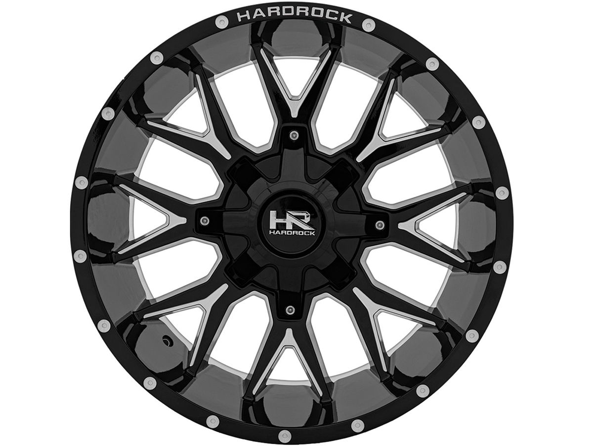 The spokes are split with a narrow window creating depth and contour. The wheel is covered in a gloss black finish with milled accents. And to complete the look, the center cap is adorned with the Hardrock logo.