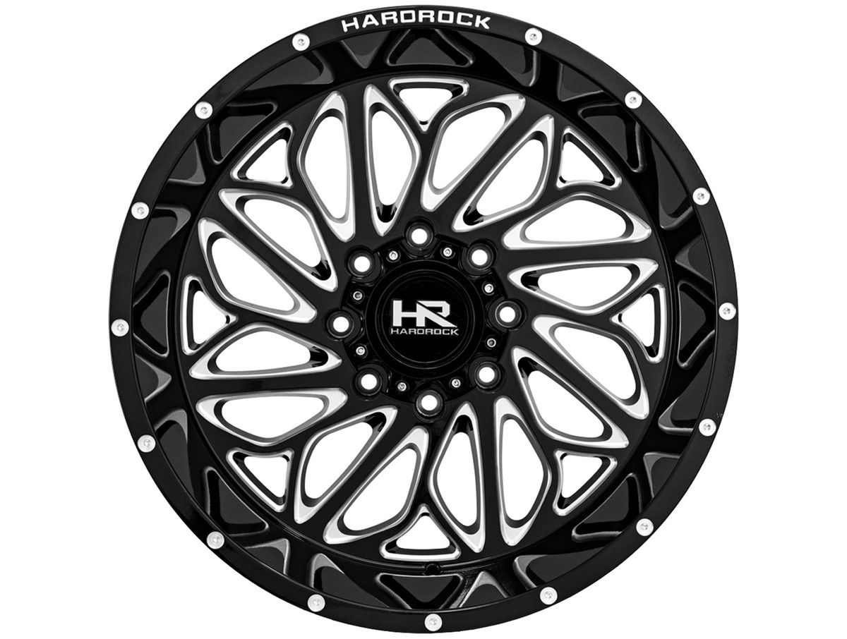 Each spoke features milled accents and they are separated by many multi-sized windows to create depth and contour. The wheel is covered in a gloss black finish that is offset by the spot milled accents around the outer edge. And to top off the look, the exposed center cap is adorned with the Hardrock logo.