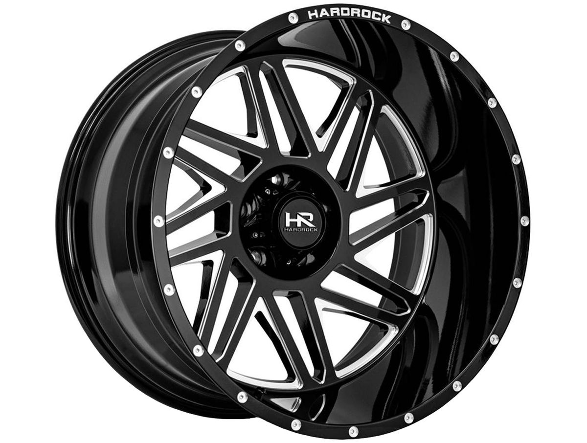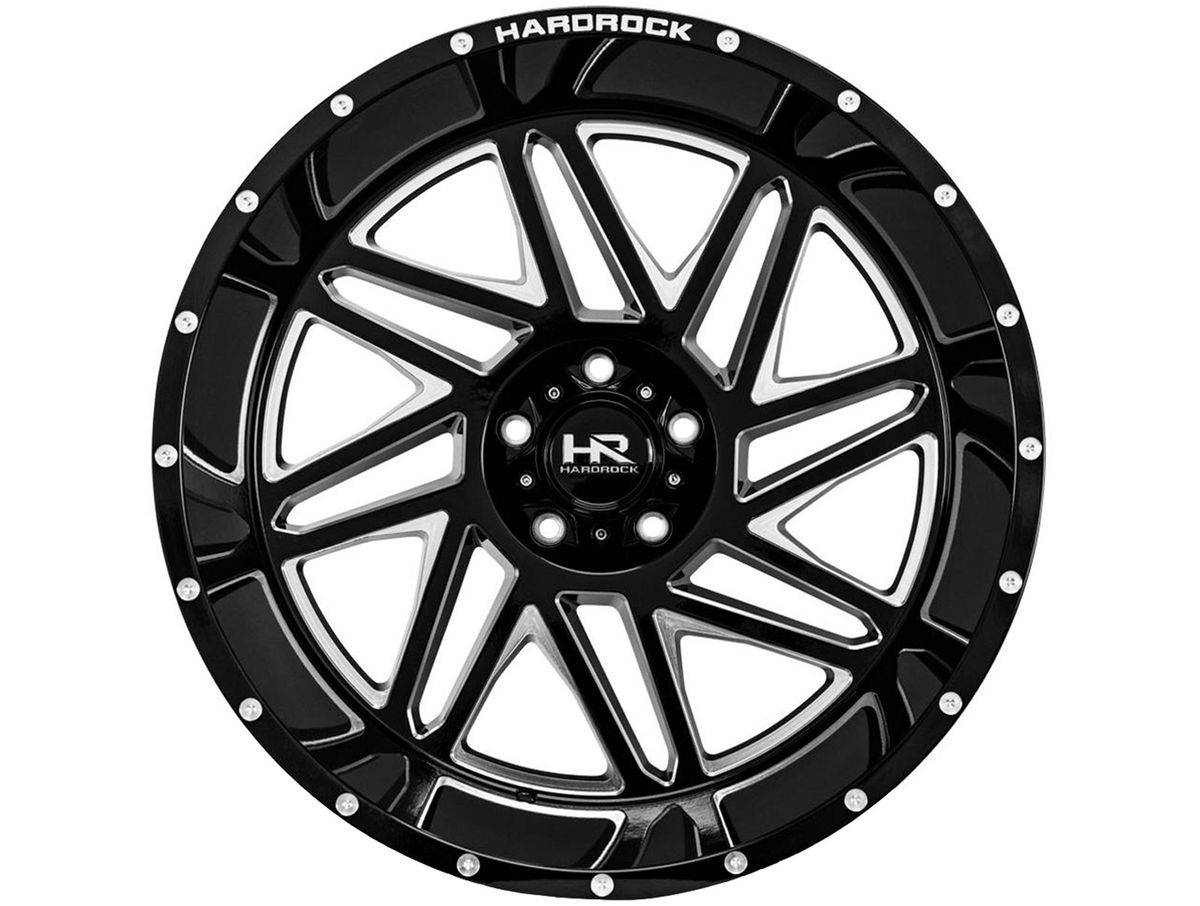 Each spoke features milled accents and a small window with razor sharp angles. The wheel is covered in a gloss black finish that is offset with spot milled accents around the outer edge. The center cap is adorned with the Hardrock logo to complete the look.