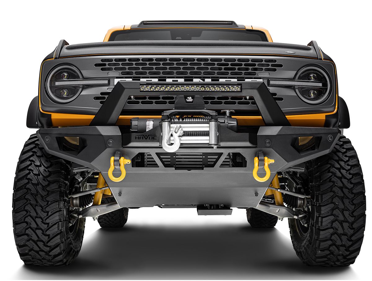 The Front Bumper Skid Plate from HAVOC Offroad is engineered to be compatible with Steel Bender front bumpers and provides critical protection for the engine and vulnerable front end components. Constructed from sturdy 3/16-inch stamped steel with a smooth exterior shell, this skid plate helps the Bronco slide over obstacles, not get hung on them. With a simple, bolt-on installation to factory mounting points, it’s easy to complete the look of your Steel Bender bumper while adding serious off-road protection too!