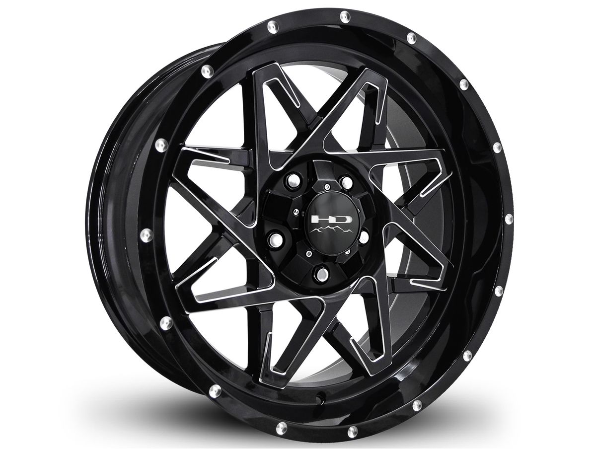 Set your vehicle apart from others with the HD Off-Road Milled Gloss Black Caliber Wheels. These wheels are designed in America and are built to last. These wheels are finished in gloss black with milled accents. They have star shaped design on the face and a simulated beadlock design.