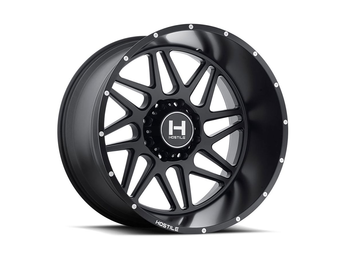 Hostile Black Sprocket Wheels feature a 8 spoke mesh design that has come to be the ultimate in lifted truck style. Hostile adds variation in the face with a slightly rotational design that puts all the spokes at an angle.
