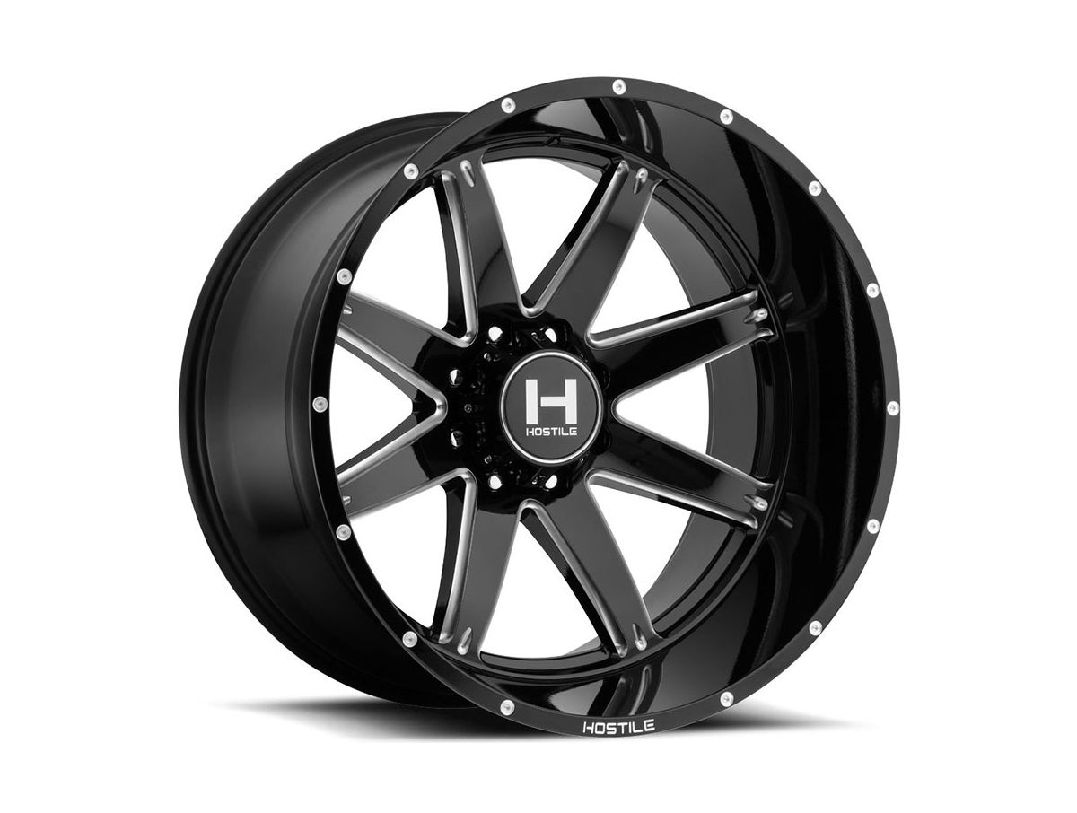 These Alpha Wheels are covered in a gloss black finish with milled accents and spot milled accents surrounding the lip that is adorned with the Hostile logo. Constructed of one piece cast aluminum, these wheels provide a sporty look and impressive strength.