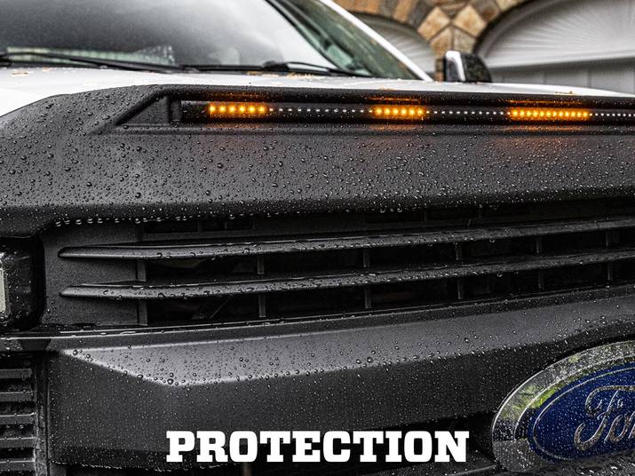 Give your vehicle upgraded visibility and superior protection with the Aeroskin® Lightshield® PRO hood protector. Its five amber built-in LED running lights provide greater visibility and adds a kinetic, visual cool factor while its form-fitting hood and window protection keeps bugs and debris out of your way. Available in a textured matte-black finish.
