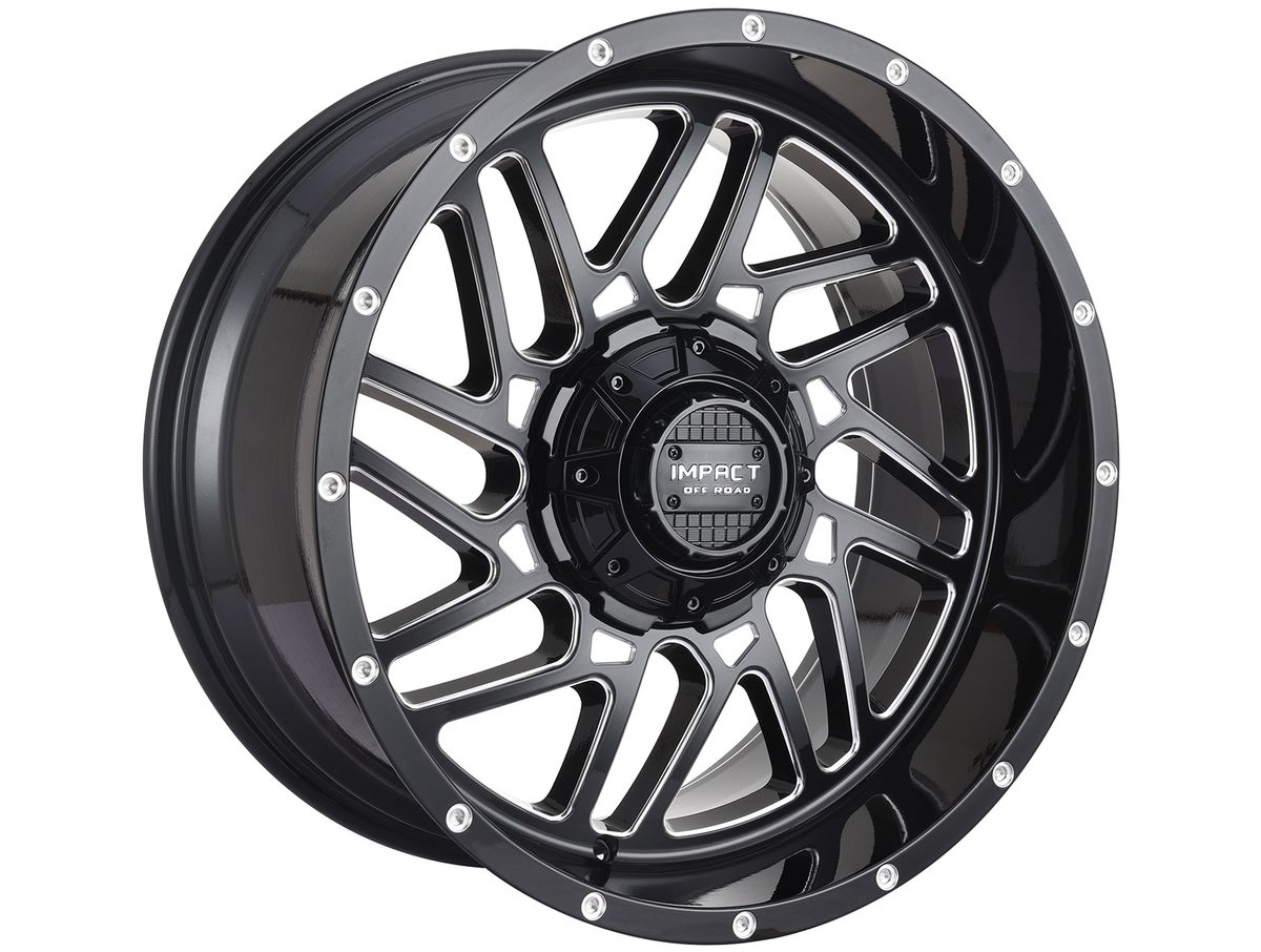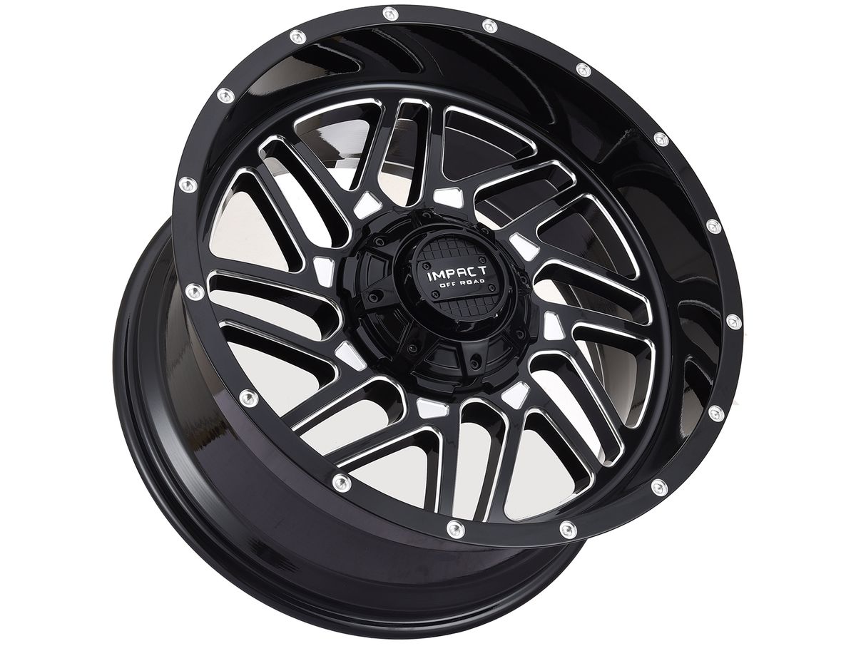 Impact Off-Road Milled Gloss Black 808 Wheels feature an off-road style, complimenting a modern spoked design. The face of the wheel is constructed with eight y-spokes that contain multiple cut-outs, creating more windows into the wheel. The y-spokes are positioned in a rotational design to give the wheel the illusion of movement. Off-road wheels and spoked designs are what Impact Off-Road specialize in, and the 808 puts those features on display.