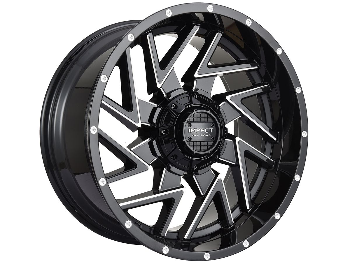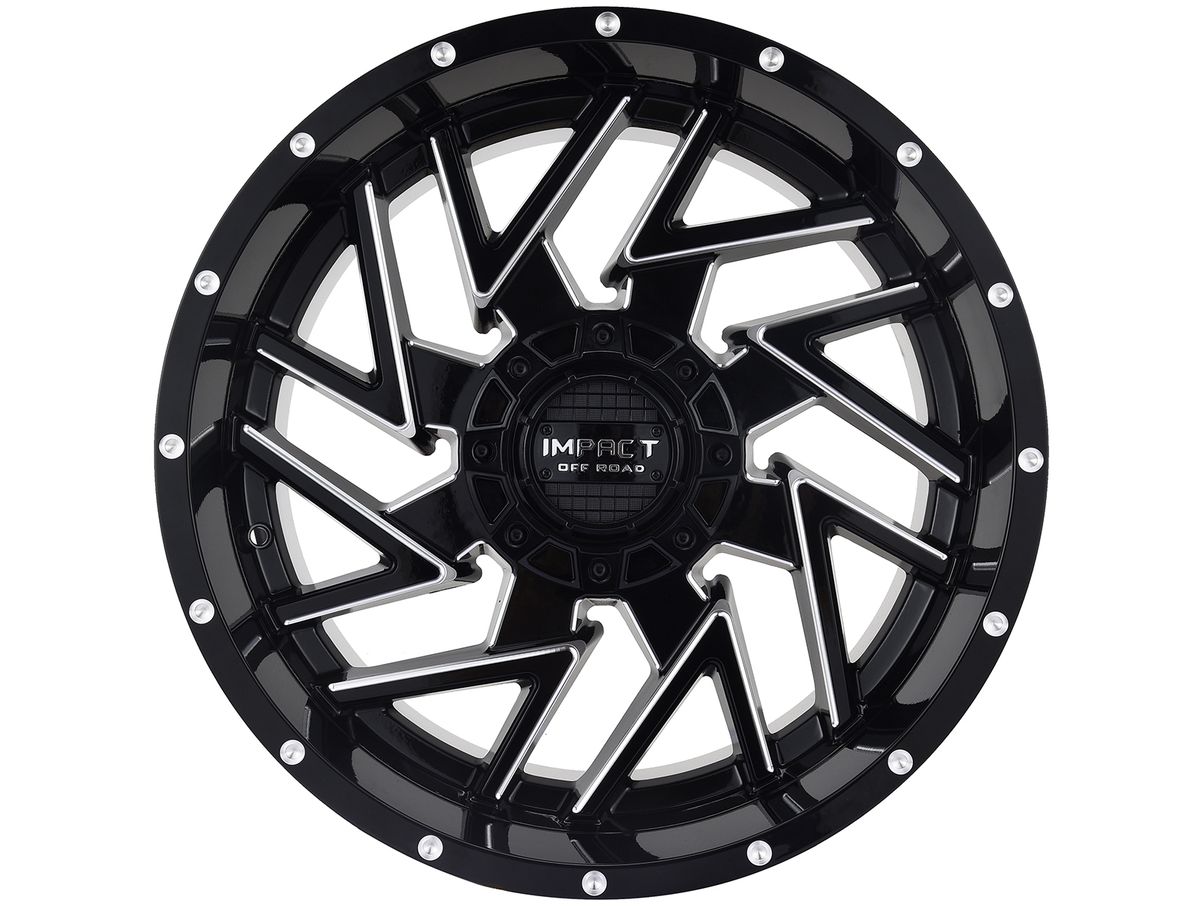 Impact Off-Road Milled Gloss Black 809 Wheels feature an off-road style, complimenting a unique modern spoked design. The face of the wheel is constructed with eight y-spokes that contain sharp angles which are guaranteed to turn heads. The y-spokes are positioned in a rotational design to give the wheel the illusion of movement. Off-road wheels and spoked designs are what Impact Off-Road specialize in, and the 809 puts those features on display.