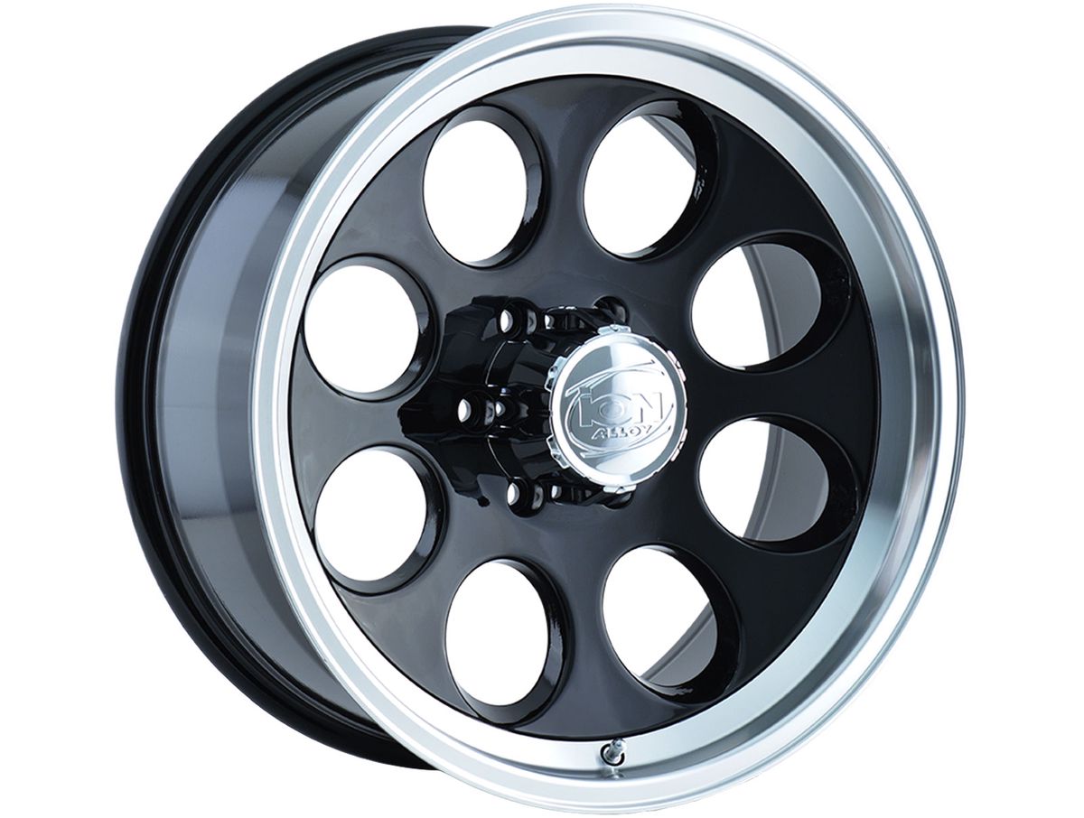 The wheel is covered in a gloss black finish that is offset by the machined wheel lip around the outer edge. The center cap is adorned with the Ion Alloy logo to complete the look.