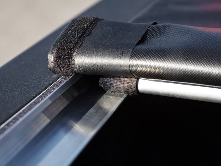 The cover stays taut thanks to the turn-dial tension control that can be adjusted with one hand. Connected support bows hold the cover up during heavy rain snow or hail. They also roll up with the cover.