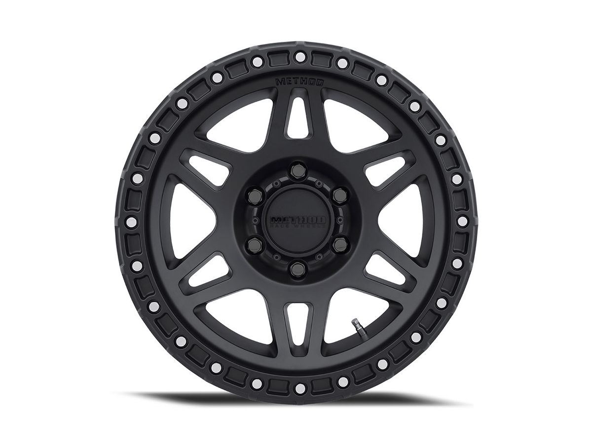 The wheel is covered in a matte black finish that is enhanced by the simulated beadlock and bolts around the outer lip. This wheel comes with Method's patented Stree-Loc V.3 technology that features an undercut on the lip to more closely resemble a true beadlock wheel. Lastly, the center cap is adorned with the Method logo to complete the look.