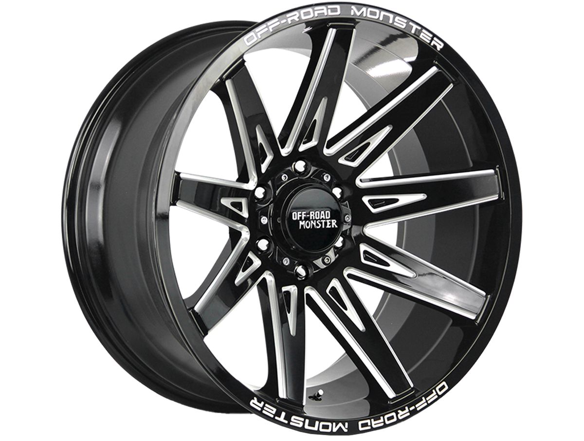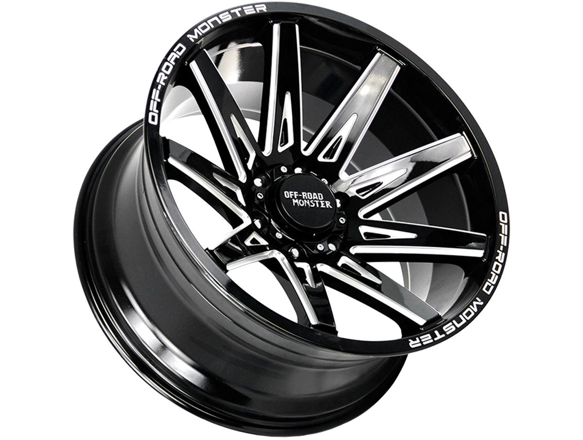 Off-Road Monster Milled Gloss Black M25 Wheels feature an aggressive concave style and spokes that fill up the center and leaves a window with sharp edges. The spokes sport triangular windows that extend outwards from the center cap. Spoked styles and large diameters are what Off-Road Monster specialize in, and the M25 puts those features on display.