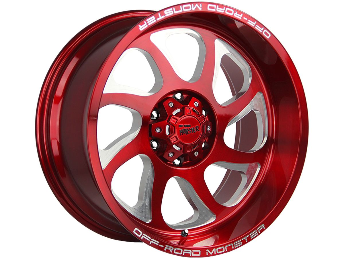 Each spoke features milled accents and sharp angles. The wheel is covered in a candy red finish that is offset with the brand name engraved around the outer edge. To finish the look, the center cap is adorned with the Off-Road Monster logo.