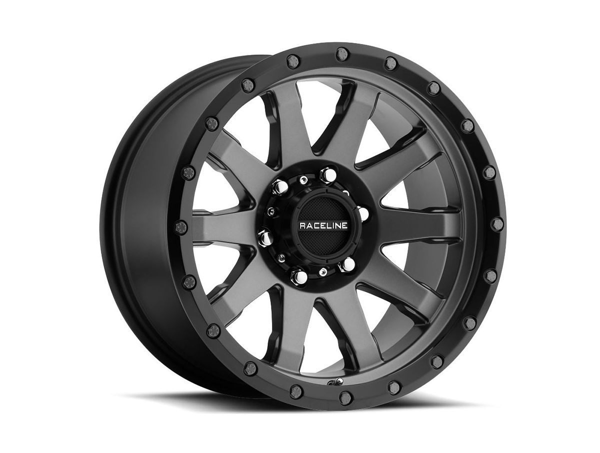 Raceline Grey Clutch Wheels offer a simple and clean 10 spoke design inspired by the titans of off-road racing. Each spoke highlighted with steps near the barrel adds depth to the face. A simulated beadlock is accented with gunmetal bolts for the street legal but race inspired stance. The wheel is covered in a gun metal finish that highlights the spokes contours and includes a Raceline logo on the center cap.