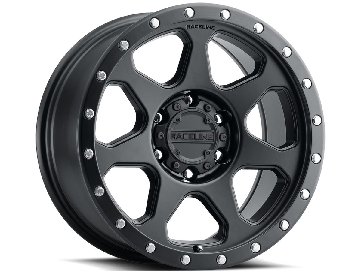 Set in a slightly concave design, the contours on the spokes enhance the depth and style on the face of the wheel. The wheel is covered in a satin black finish that is offset by the simulated bead ring around the outer edge. The center cap is adorned with the Raceline logo to complete the look.