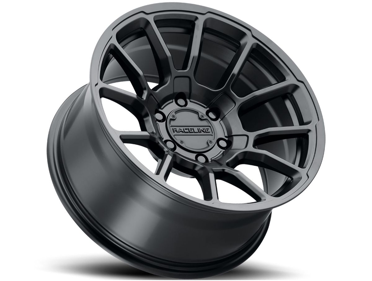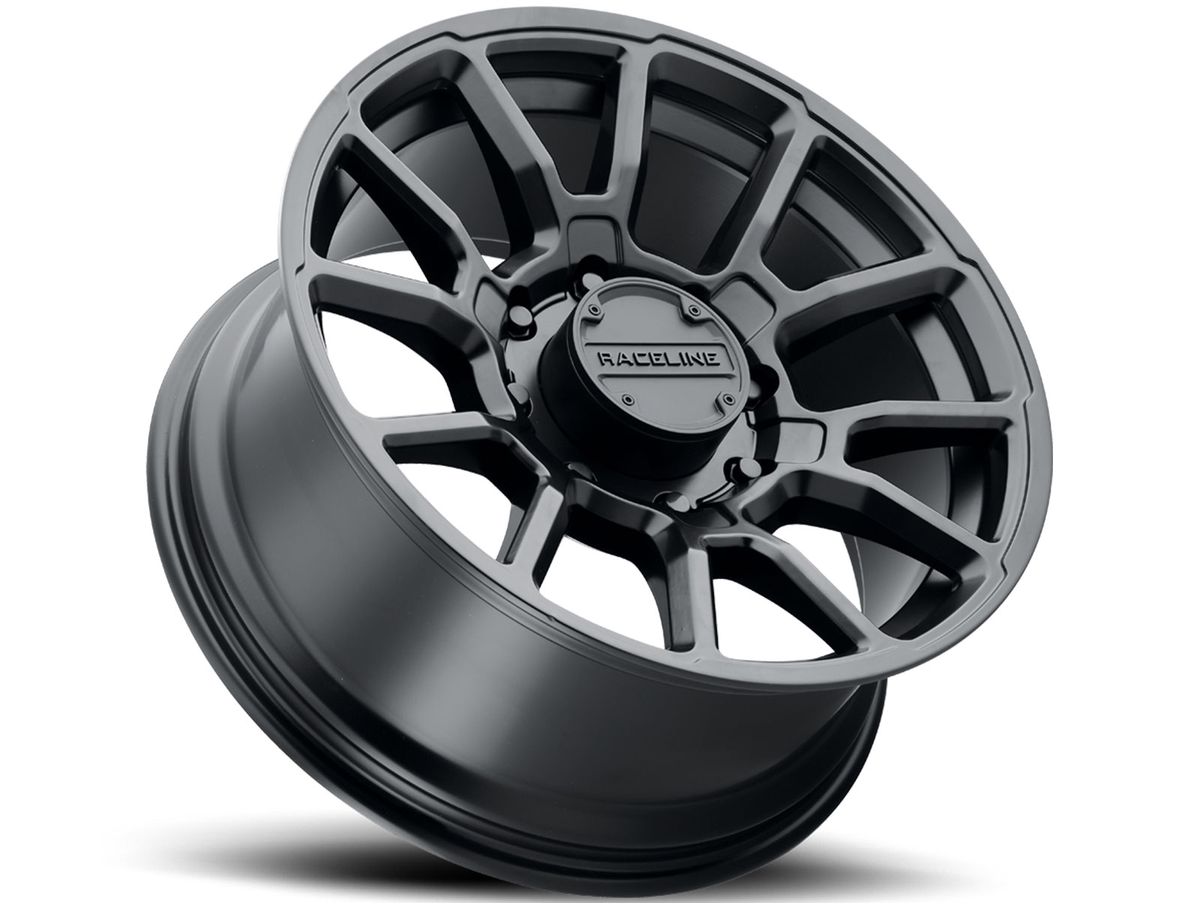 The wheel is covered in a satin black finish that is offset by the contours in the lip around the outer edge. The center cap is adorned with the Raceline logo to complete the look.