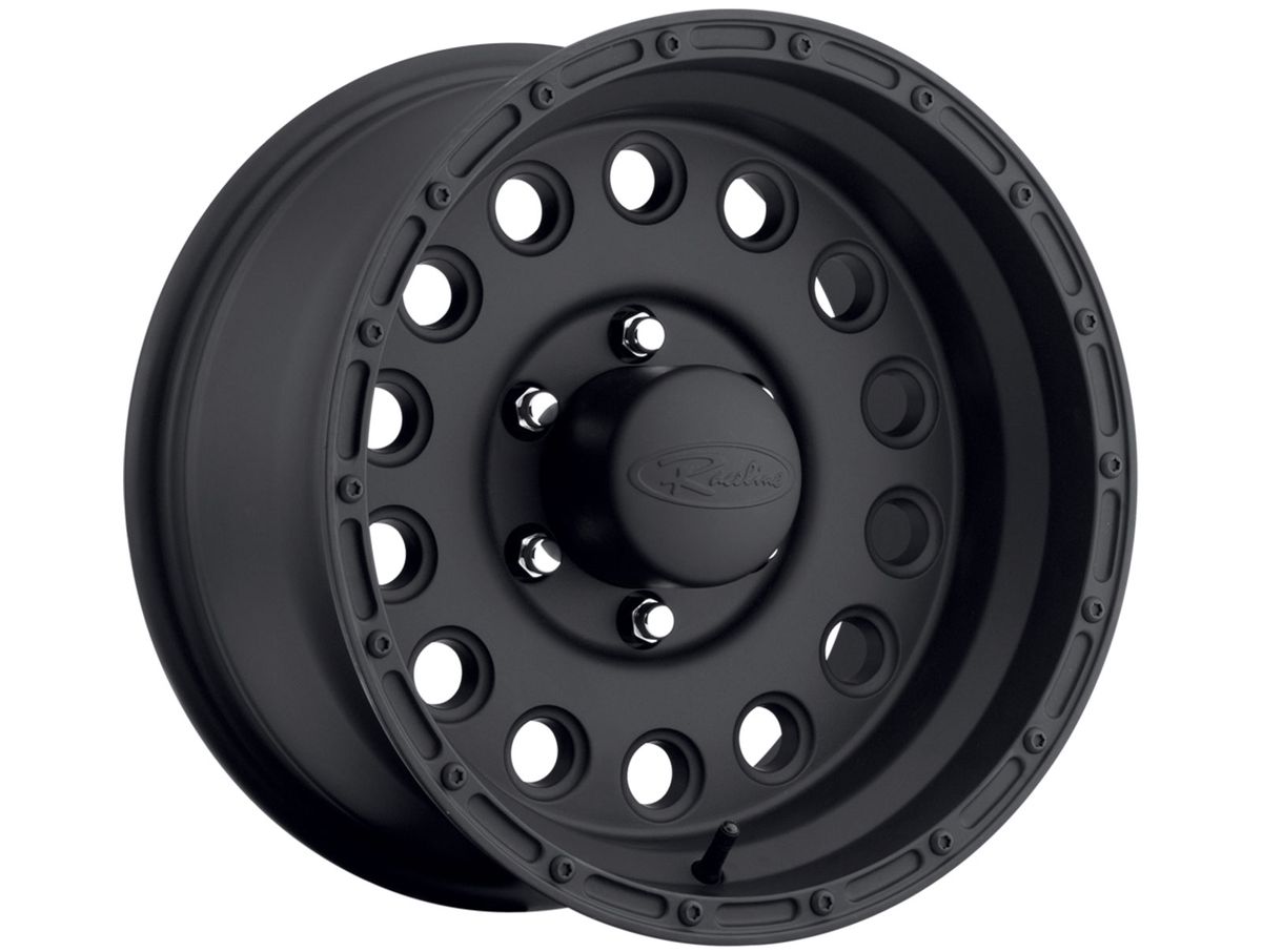 The wheel is covered in a satin black finish that is offset by the contours and simulated beadlock design around the outer edge. The center cap is adorned with the Raceline logo to complete the look.