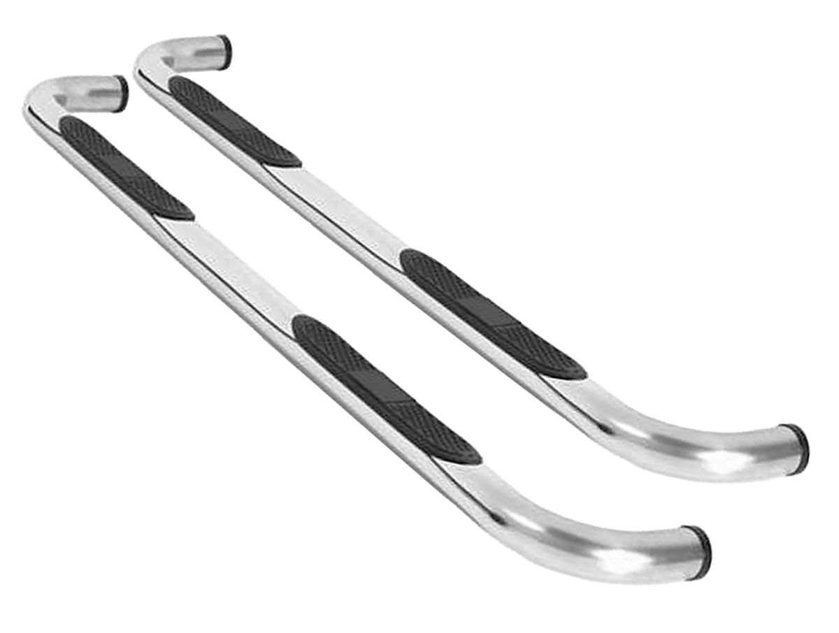 Traditional style 3-inch tubular step bar for ease of entry from a great looking side bar. The step bars are made from heavy-duty 3" x .07" wall tubular polished 304 stainless steel for a custom show finish. Each bar is fitted with a reinforced no slip polyester step pad precisely positioned for vehicle entry and exit.