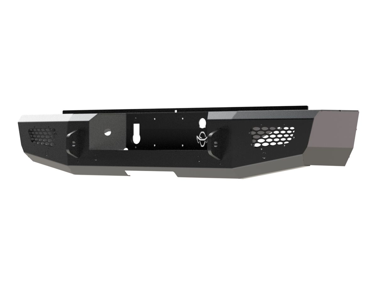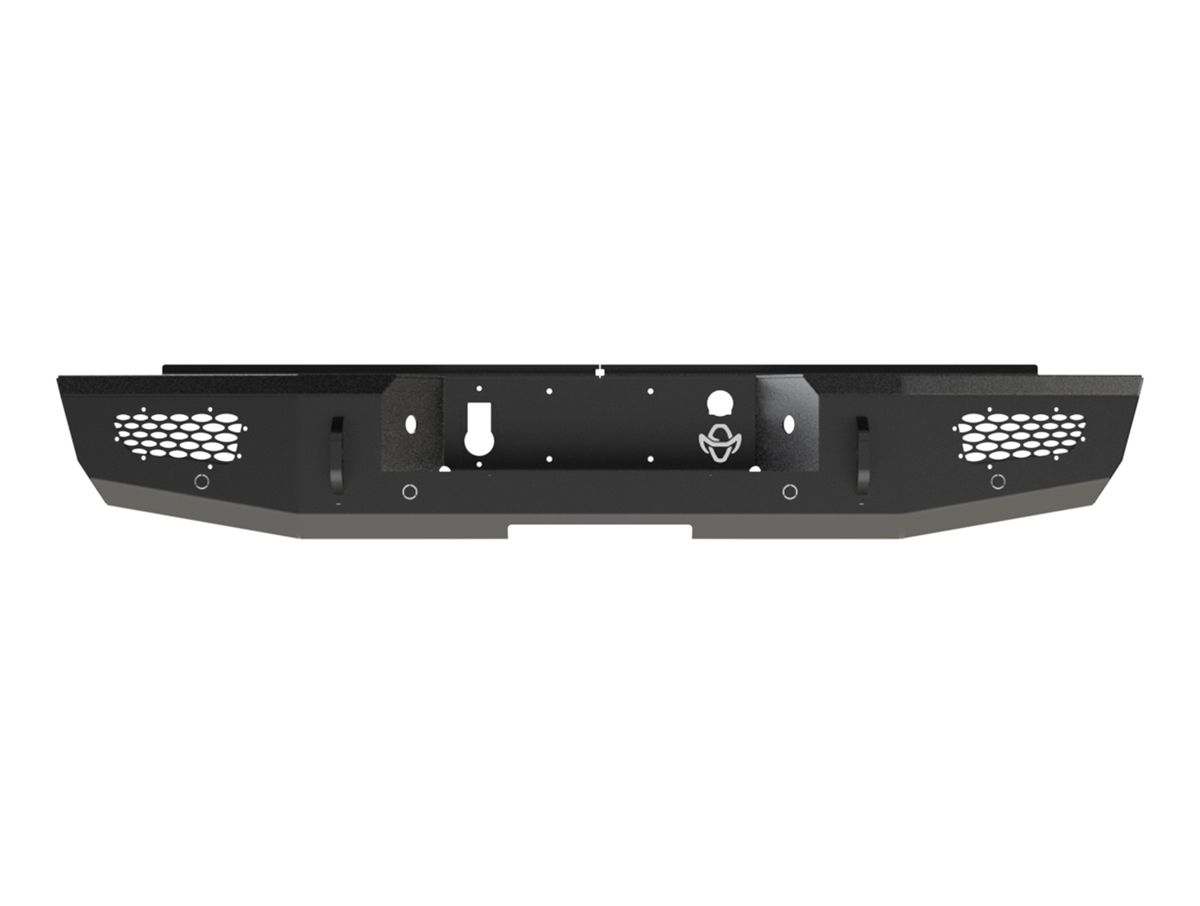 The Ranch Hand Midnight Series Rear Bumper is constructed from 3/16" thick smooth steel along with 12 gauge steel inserts. It is protected from rust and corrosion with a textured matte black powder coat and it comes with pre-drilled holes for trailer hardware and rear facing parking sensors. Also, it has light mounts to allow use of LED cube lights or factory fog lights if equipped.