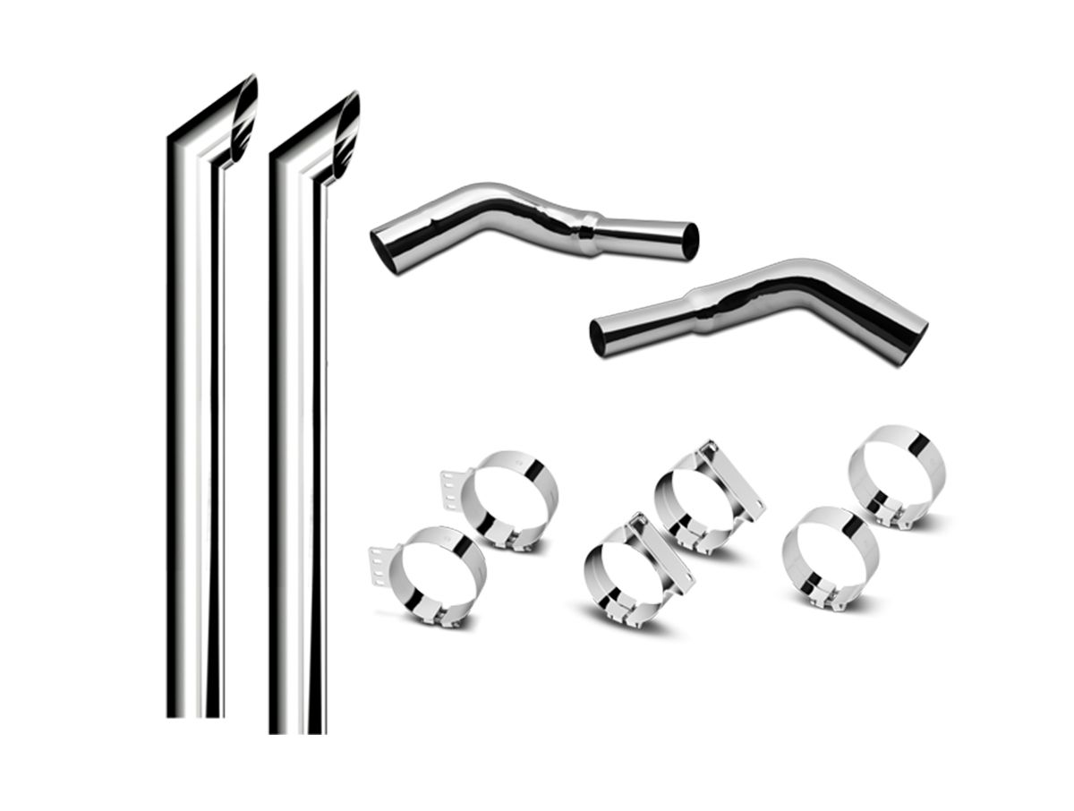 Featuring a superb shine, backed by a 3-year warranty, these premium exhaust stacks come in 5", 6", 7", and 8" diameters, and six tip styles to suit any taste. Top pipes are available in multiple lengths up to 120" for the perfect fit, finish, and style. RoadWorks offers premium style, unmatched reliability, and a readily available selection of chrome-plated stacks, elbows, clamps, and kits to bring your custom truck to life.