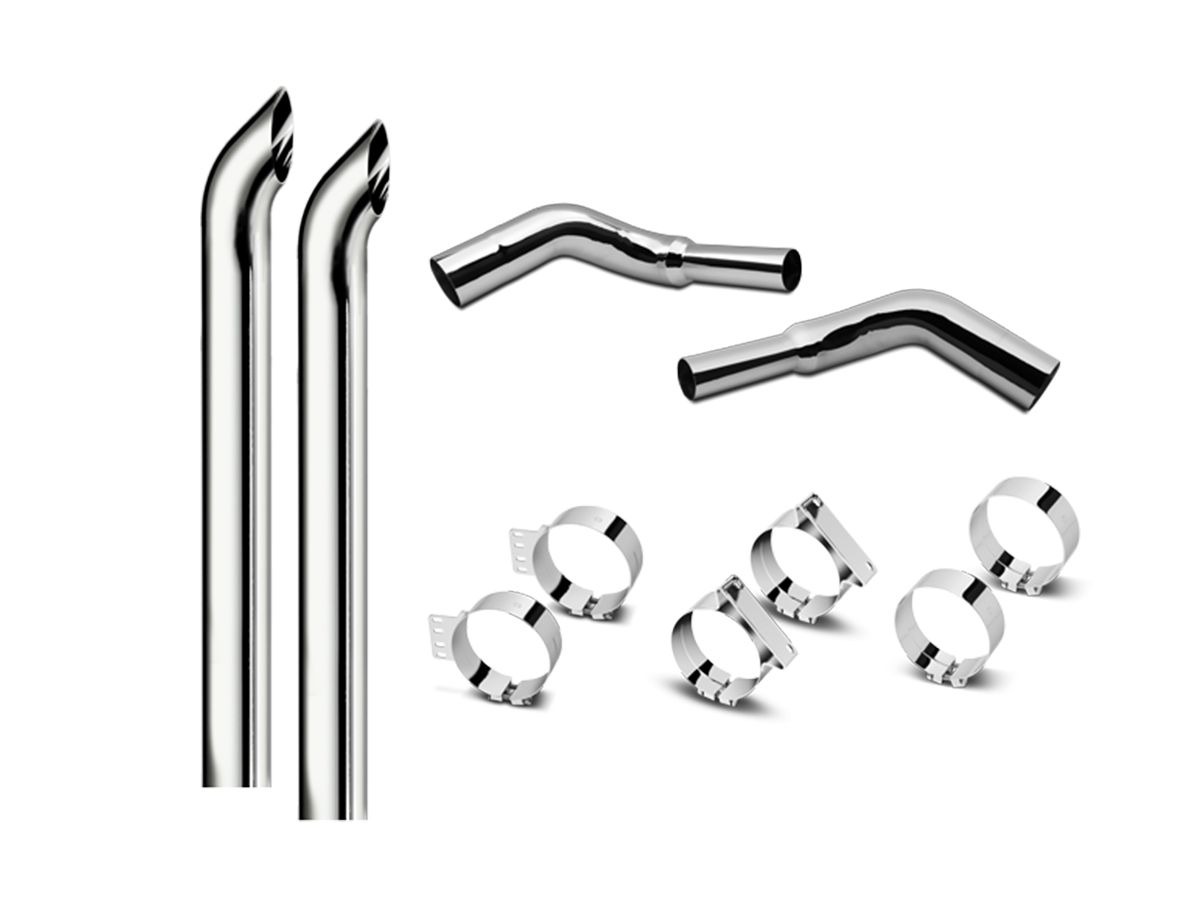 Featuring a superb shine, backed by a 3-year warranty, these premium exhaust stacks come in 5", 6", 7", and 8" diameters, and six tip styles to suit any taste. Top pipes are available in multiple lengths up to 120" for the perfect fit, finish, and style. RoadWorks offers premium style, unmatched reliability, and a readily available selection of chrome-plated stacks, elbows, clamps, and kits to bring your custom truck to life.