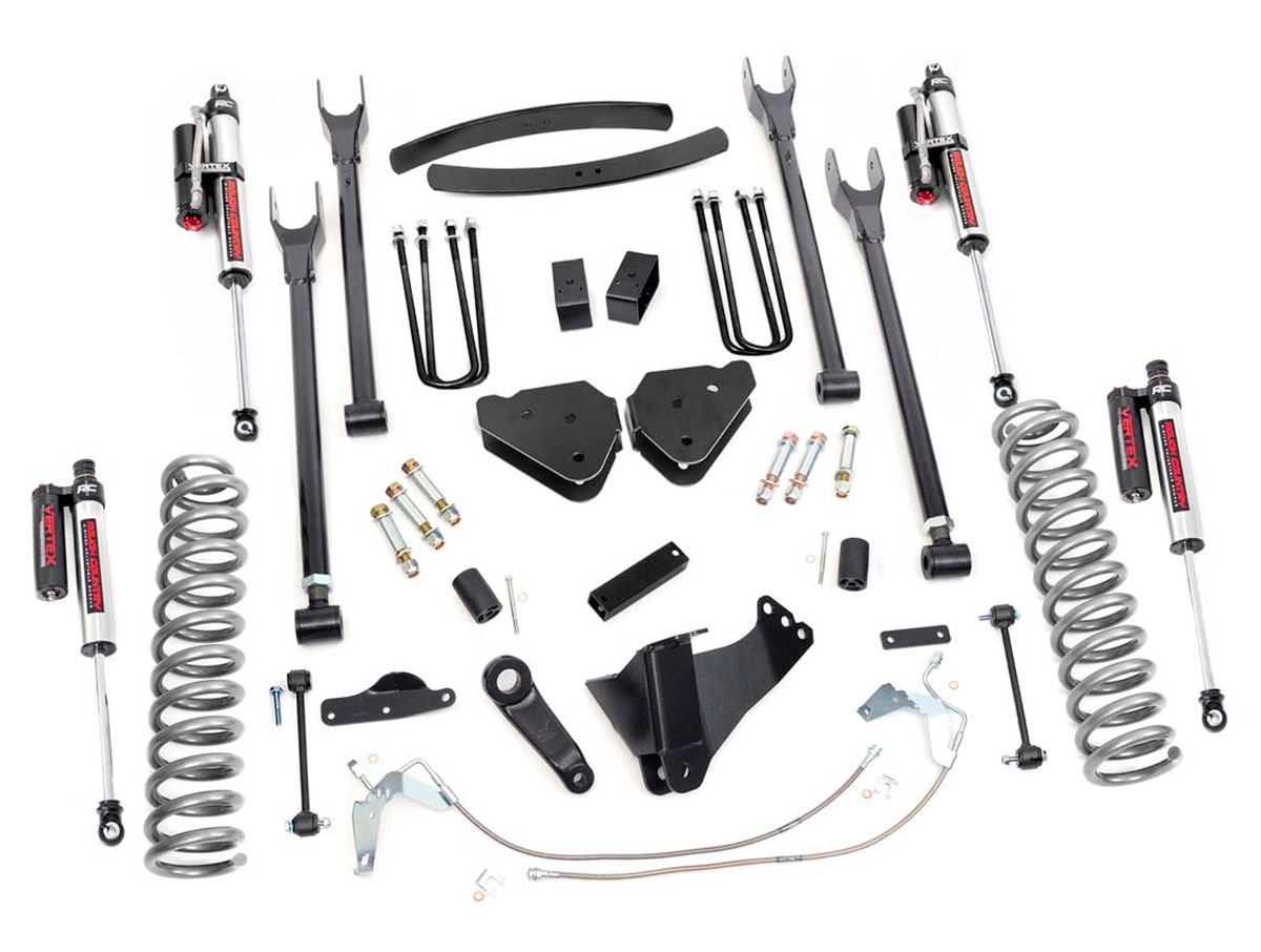The ideal pickup truck is equally at home on the road and off of it. So how do you make your Ford trail-ready while retaining a smooth, factory ride on the highway? Rough Country 6" 4-link lift kits are the answer. This kit not only replaces your factory shocks with upgraded trail-ready shocks, but it also ups the ante with a set of heavy duty upper control arms and adjustable lower control arms. These parts work in tandem to deliver outstanding off-road performance while keeping things comfortable for you and your passengers. Multiple shock absorber options are available for the kit, from the versatile N3 to the steel-bodied Vertex.