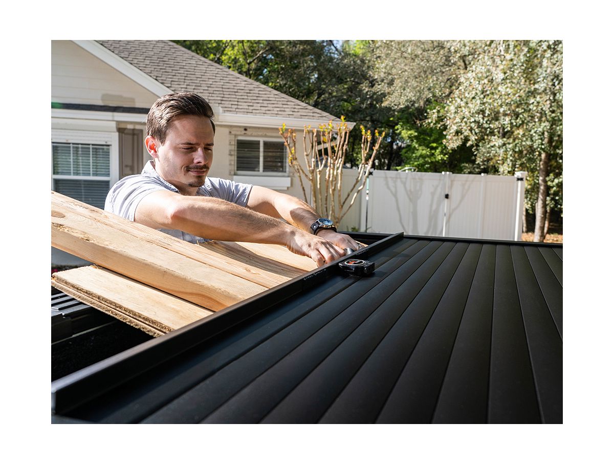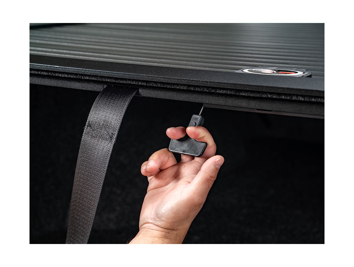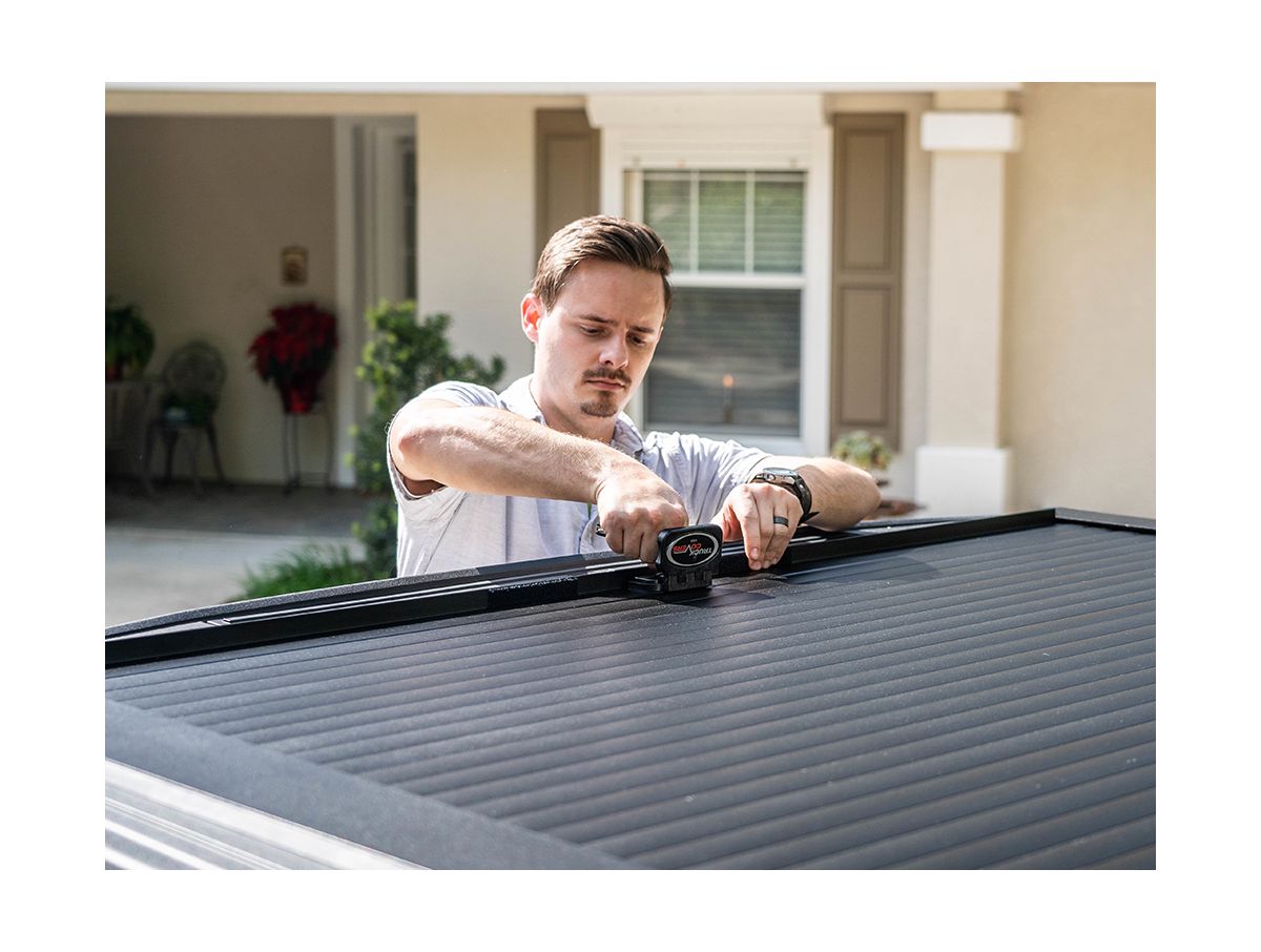Operating the American Roll Cover is quick and easy. Simply use the provided key to unlock the cover or unlock your tailgate to access the keyless entry latch. The cover is tension-driven to allow smooth retracting into its ultra-low-profile canister, measuring only eight inches tall and deep. The integrated pull strap helps you easily open and close the cover from your tailgate. For convenience, the American Roll Cover uses a built-in auto-latch system that locks the cover in 12-in. increments along the bed rails.