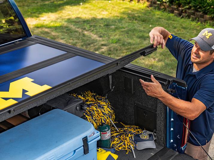 Pairing legendary university tradition with unmatched utility, the limited-edition University of Michigan RealTruck® UnderCover® Ultra Flex hard folding truck bed cover is in a class of its own. Built on the proven Ultra Flex platform, this special-edition release proudly features official U-M branding—making it a must-have for any die-hard Wolverines fan.