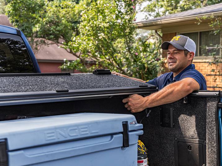 When it’s time to load up your gear, simply drop the tailgate, pull the cable release, and fold the cover forward. Secure it in the 2/3 open position with built-in retention straps, or stand it fully upright using the integrated prop rods for complete bed access. When closed, the cover automatically latches for enhanced security—and with the tailgate locked, your truck bed is sealed tight.
