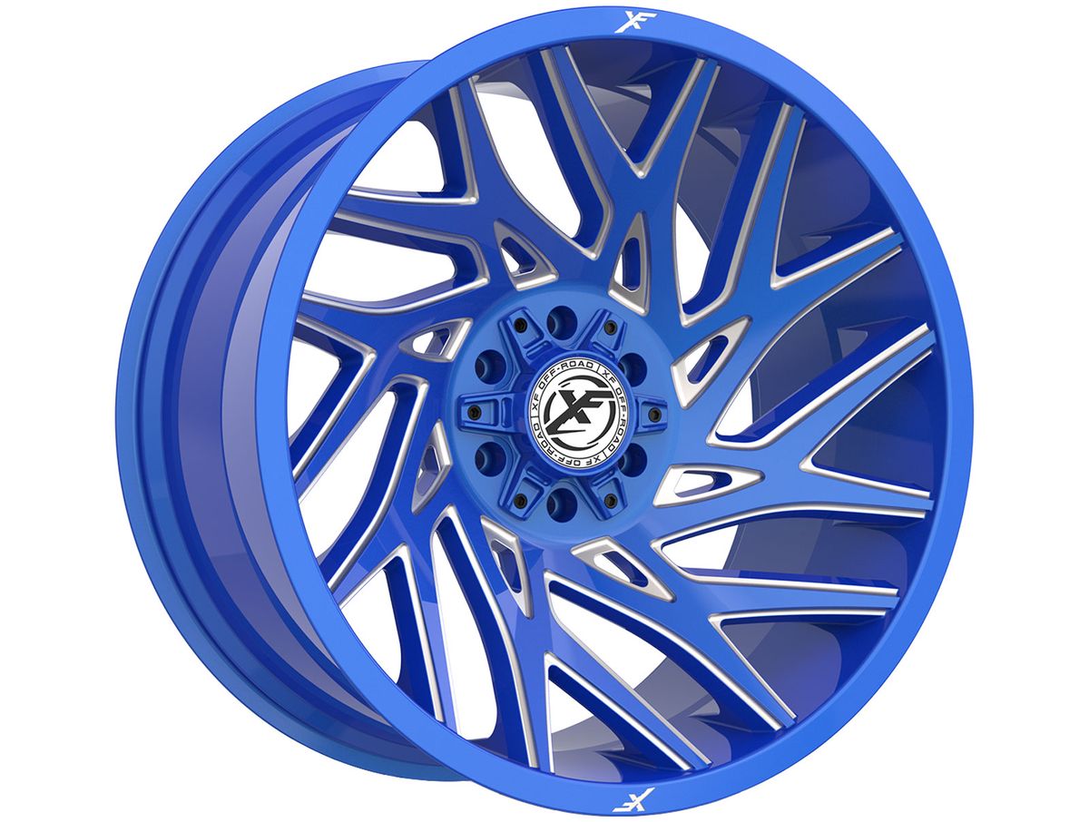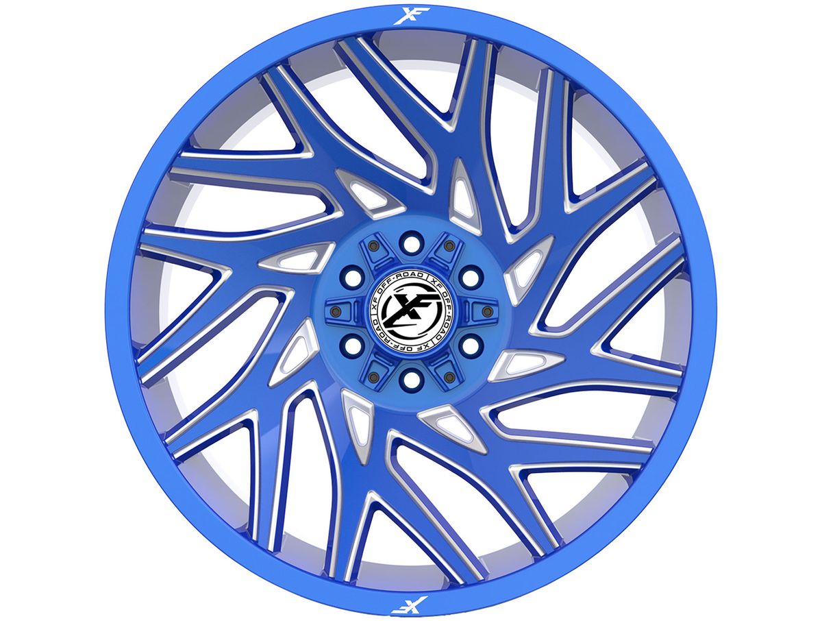 Each spoke features milled accents and a small window with razor sharp angles. The wheel is covered in a anodized blue finish that is offset by the "XF" engraved around the outer edge. The center cap is adorned with the XF Offroad logo to complete the look.