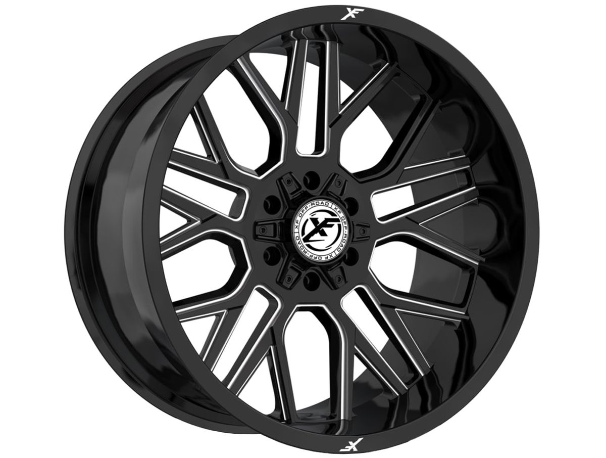 Each spoke features milled accents that wrap toward the center of the wheel and meet at the center cap. The wheel is covered in a gloss black finish that is offset with XF engraved around the outer edge. And to finish off the look that XF Offroad is known for, the center cap is adorned with the brand's logo.